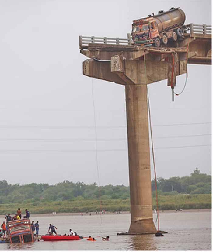 इससे पहले बुधवार सुबह वडोदरा के पादरा कस्बे के पास गंभीरा गांव के पास आणंद और वडोदरा जिलों को जोड़ने वाले चार दशक पुराने पुल का एक हिस्सा ढह जाने से कई वाहन महिसागर नदी में गिर गए थे। वडोदरा जिले के पुलिस अधीक्षक रोहन आनंद ने दिन में बताया, 'अब तक 16 शव बरामद किए जा चुके हैं, जबकि तीन से चार लोग अभी भी लापता हैं। तलाशी और बचाव अभियान अभी भी जारी है।'