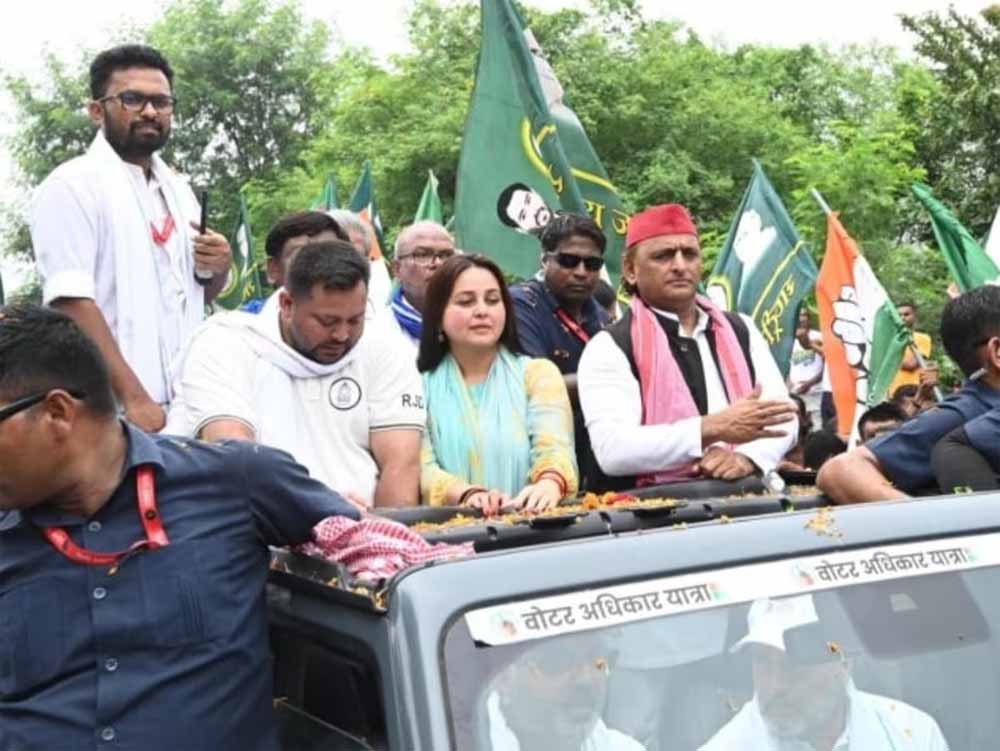 बिहार में एसआईआर के खिलाफ जारी राहुल गांधी की वोटर अधिकार यात्रा में शनिवार को सपा अध्यक्ष और यूपी के पूर्व सीएम अखिलेश यादव शामिल हुए। यात्रा के 14वें दिन आरा में जनसभा को अखिलेश यादव ने संबोधित करते हुए मोदी सरकार पर जमकर निशाना साधा। सपा अध्यक्ष ने बीजेपी, सरकार और अधिकारियों को चुनावी 'तीन तिगाड़ा' बताते हुए कहा कि इन्हें इंडिया गठबंधन तोड़ेगा। अखिलेश ने कहा कि अवध से हम लोगों ने बीजेपी को भगाया है, अब मगध से भाजपा को भगाने की जिम्मेदारी आप लोगों की है।