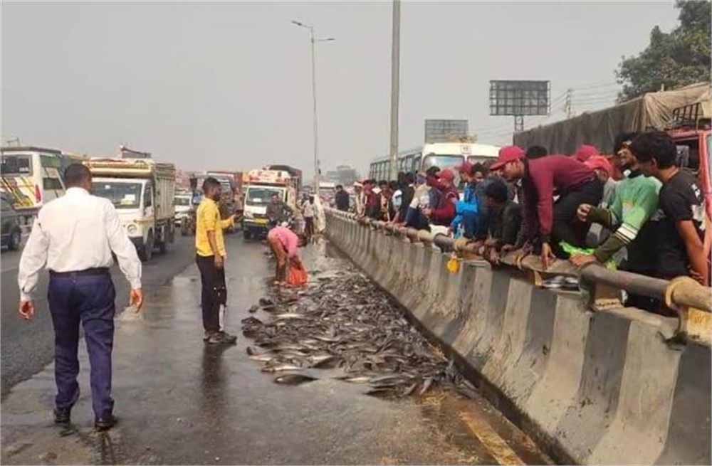 सोनीपत में नेशनल हाइवे-44 पर शुक्रवार को सुबह उस समय लंबा जाम लग गया, जब एक मछलियों से भरा ट्रक पलट गया। कैंटर में भरी मछलियां रोड़ पर फैल गई। यह नज़ारा देखते ही वहां लोगों की भीड़ जुट गई, जिसकी वजह से हाईवे पर जाम लग गया।