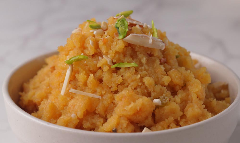 ड्राई फ्रूट्स मिलाएं- जब हलवा गाढ़ा हो जाए, तो इसमें कटे हुए बादाम और काजू मिलाएं और अच्छी तरह से मिलाएं। आप हलवे में अन्य ड्राई फ्रूट्स जैसे कि पिस्ता या अखरोट भी मिला सकते हैं।