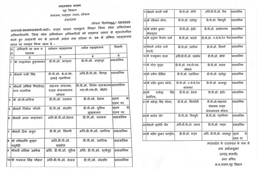 मध्यप्रदेश में गृह विभाग से संबंधित डीपीओ स्तर पर थोक में तबादले हुए हैं। विभाग ने 24 अधिकारियों का तबादला आदेश जारी किया है। जिला लोक अभियोजन अधिकारियों के इधर से उधर तबादले हुए हैं। इसी तरह अतिरिक्त जिला लोक अभियोजन अधिकारियों को भी स्थानांतरित किया गया है। तबादलों में कई अधिकारियों को जिलों की नई जिम्मेदारी मिली हैं। देखें सूची…