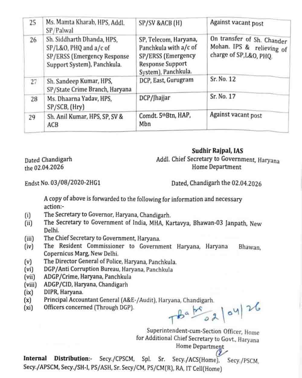 हरियाणा पुलिस प्रशासन में बड़ा फेरबदल, 24 IPS और 5 HPS अधिकारियों के हुए तबादले
