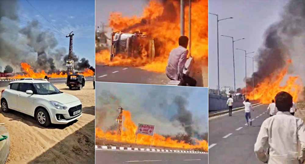 नेशनल हाईवे पर तेल टैंकर पलटा, भीषण आग में 200 मीटर तक उठीं लपटें; एक की जिंदा जलकर मौत