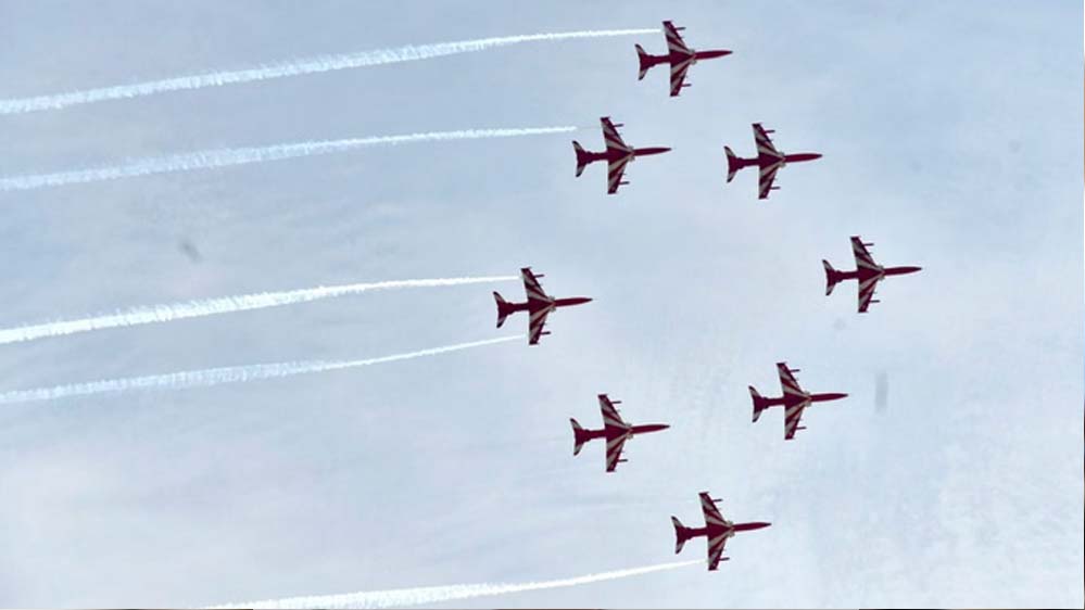 साथ ही कभी 360 तो कभी 90 डिग्री पर घूमकर हैरतअंगेज कारनामे किए। अंत में टीम के 2 फाइटर जेट ने हवा में धुएं से हार्ट बनाकर दर्शकों को धन्यवाद कहा। इसी के साथ एयर-शो संपन्न हुआ।