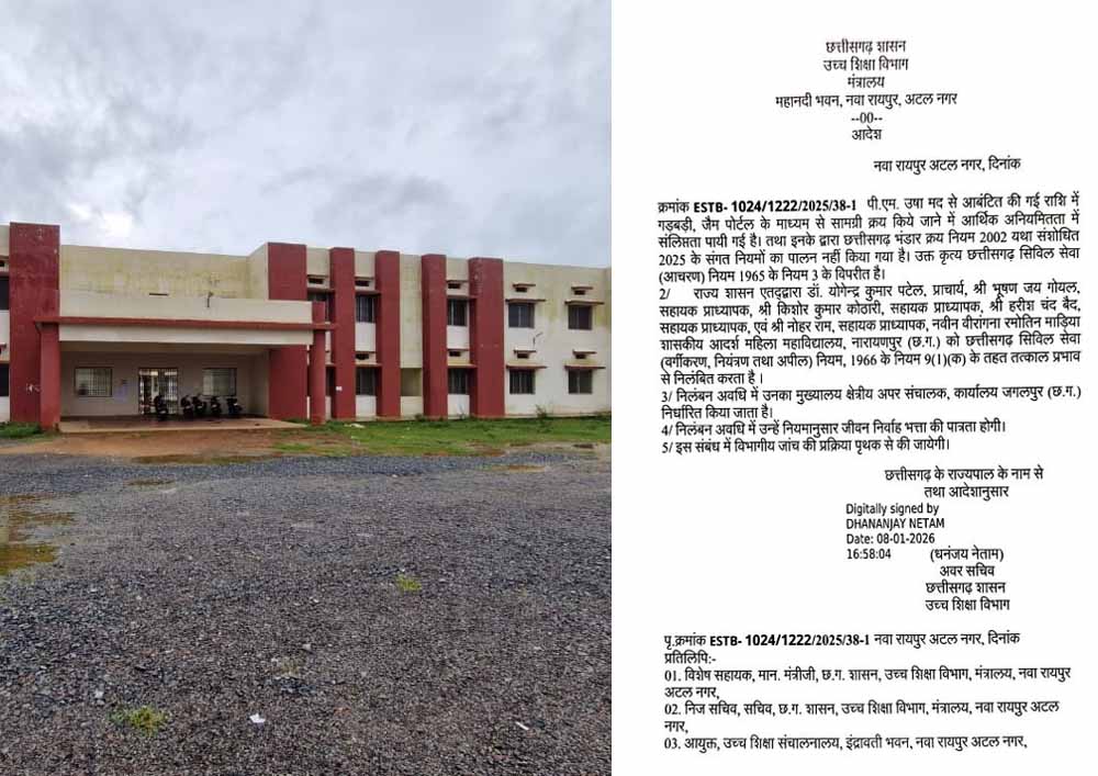 छत्तीसगढ़ शासन के उच्च शिक्षा विभाग ने वित्तीय अनियमितताओं के गंभीर मामले में बड़ी प्रशासनिक कार्यवाही करते हुए शासकीय आदर्श महिला महाविद्यालय, नारायणपुर के छह प्राध्यापकों को तत्काल प्रभाव से निलंबित कर दिया है। यह कार्यवाही पी.एम. उषा मद से आबंटित राशि के दुरुपयोग तथा शासन के निर्धारित वित्तीय नियमों का पालन नहीं करने के आरोपों के बाद की गई है।