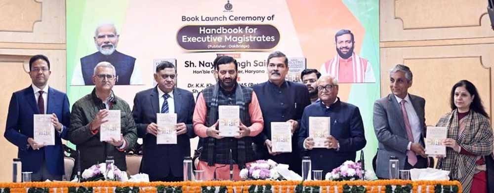 हरियाणा के मुख्यमंत्री नायब सिंह सैनी ने मंगलवार को ‘हैंडबुक फॉर एग्जीक्यूटिव मजिस्ट्रेट्स’ का विमोचन किया। यह पुस्तक वरिष्ठ आईएएस अधिकारी (सेवानिवृत्त) डॉ. केके खंडेलवाल और हरियाणा सरकार में अतिरिक्त मुख्य सचिव अपूर्व कुमार सिंह द्वारा लिखी गई है। हरियाणा आईएएस ऑफिसर्स एसोसिएशन के तत्वाधान में आयोजित पुस्तक विमोचन समारोह में आईएएस एसोसिएशन के पदाधिकारी तथा कई वरिष्ठ प्रशासनिक अधिकारी उपस्थित रहे। इस मौके पर हरियाणा आईएएस ऑफिसर एसोसिएशन के सचिव डॉ. अमित अग्रवाल ने एसोसिएशन की ओर से मुख्यमंत्री नायब सिंह सैनी को स्मृति चिन्ह भेंट किया।